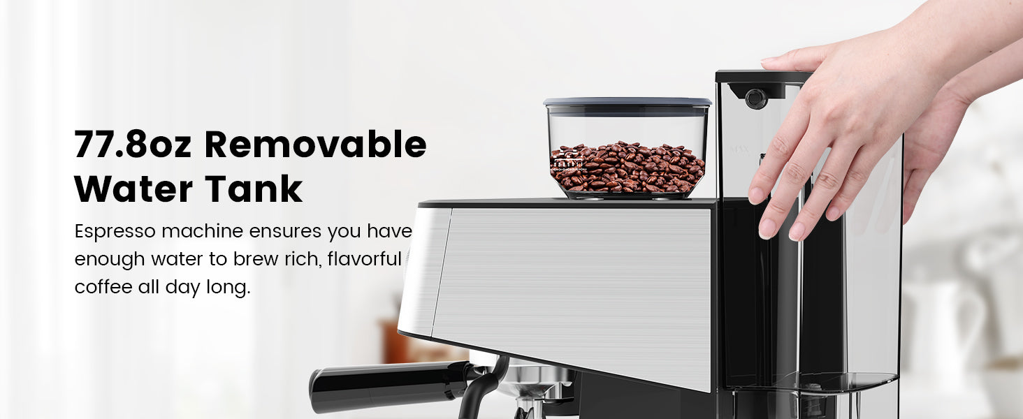 Enjoy consistent brewing results with PID smart temperature control, maintaining accuracy within 30°F for perfect espresso extraction. The machine is also designed for convenience, featuring a removable 2.8-liter water tank and an easy-to-clean drip tray.