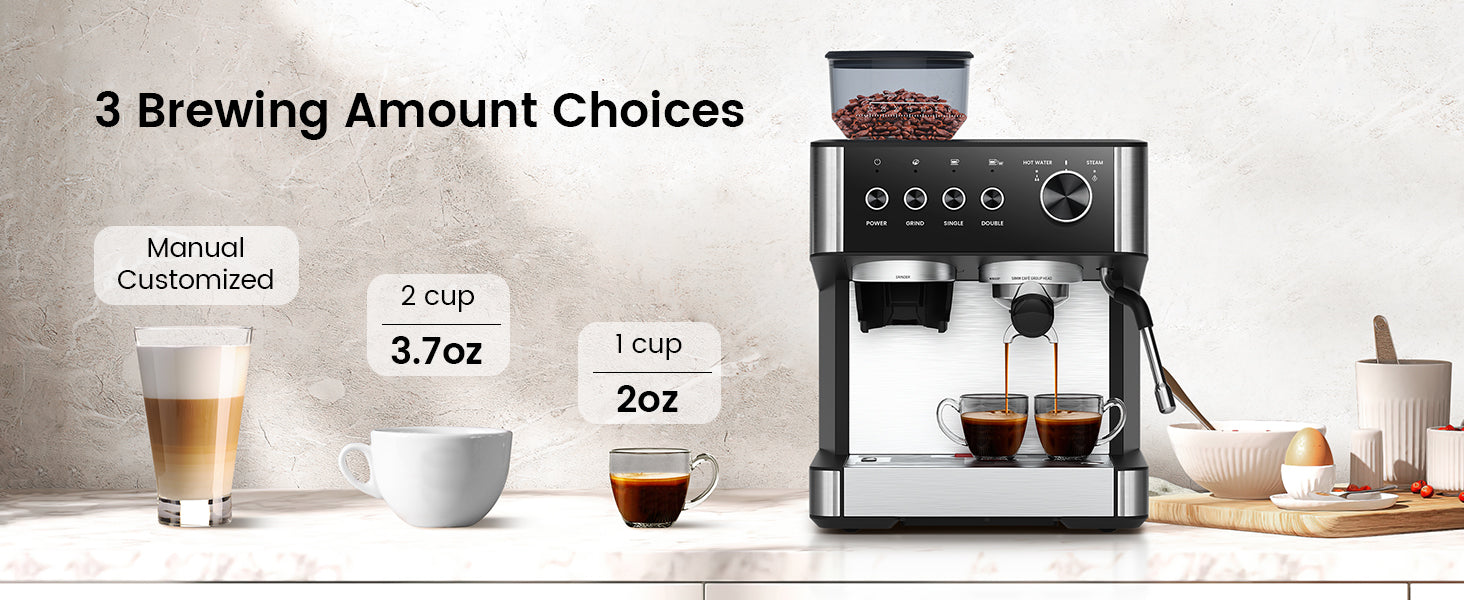 Personalize your brew with adjustable grind settings, customizable grinding time, and options for single or double-shot output. Tailor each cup to your exact preferences for a truly unique coffee experience.