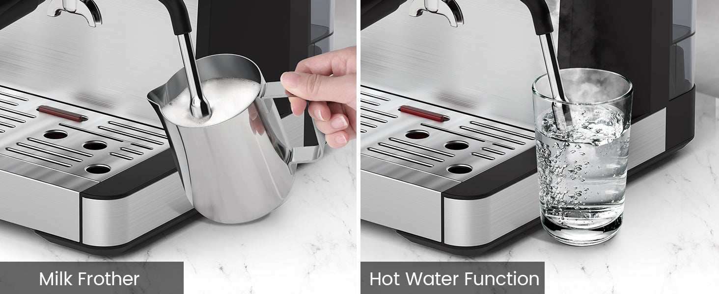 Craft perfect lattes, cappuccinos, and more with the high-pressure milk frother. Whether you're frothing milk for a creamy foam or dispensing hot water for tea, the steam wand is versatile and easy to clean—just switch modes and flush with hot water.