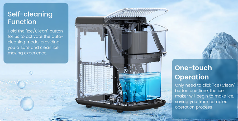 Maintaining your ice maker is hassle-free with the built-in self-cleaning function. Simply press and hold the "Ice/Clean" button for 5 seconds to initiate an automatic cleaning cycle. In just 15 minutes, your machine will be spotless and ready for use, eliminating the need for manual scrubbing.